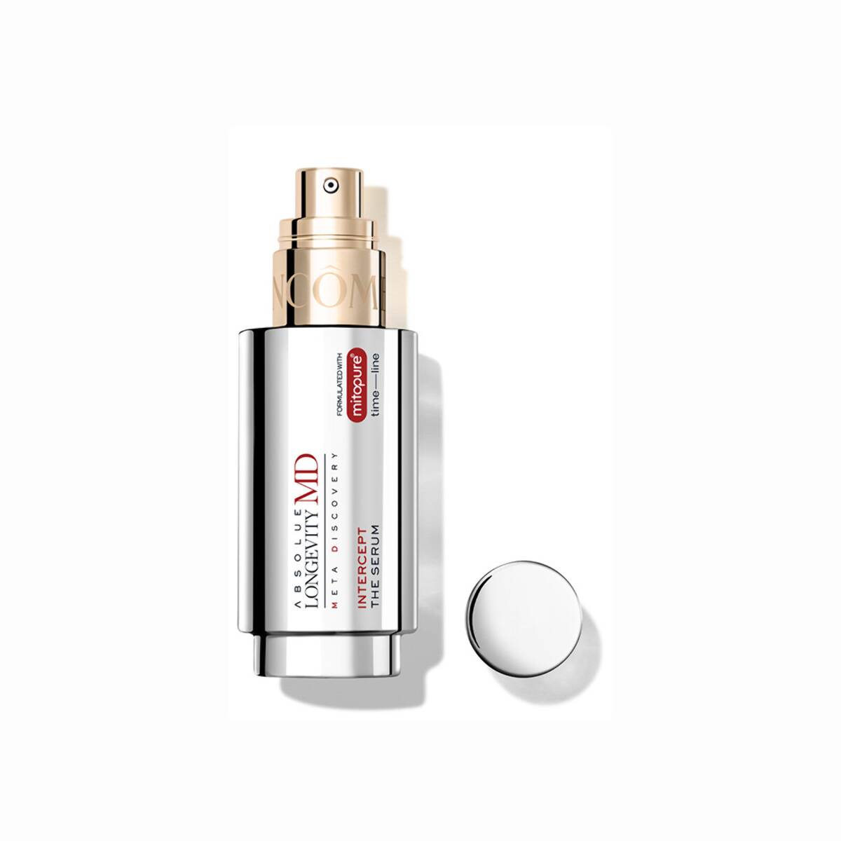 Oppdag Absolue Longevity MD Meta Discovery Intercept The Serum fra Lancôme, en banebrytende løsning designet for proaktivt å redusere aldringstegn når de oppstår. Beriket med patentert Mitopure® fra Time-line, en 98,5 % ren mikronisert form av Urolithin-A. Denne innovative formelen støtter mitokondriell resirkuleringsprosess som styrker hudens cellulære batterier. Intercept-effekten retter seg spesifikt mot hudens strukturelle integritet og motstandskraft etter hvert som cellefornyelsen begynner å avta. Kombinert med den eksklusive Intercept Compound™, genererer den +3M nye overflateceller per dag, noe som resulterer i synlig forbedret elastisitet og +42 % mer glød. Den ultrasensoriske serumteksturen gir resultater med høy ytelse, samtidig som den etterlater huden med en revitalisert glød og en følelse av dyp velvære. Det proaktive valget for å bevare ungdommelig hud, med klinisk bevis for synlig effekt på 3 typer rynker.